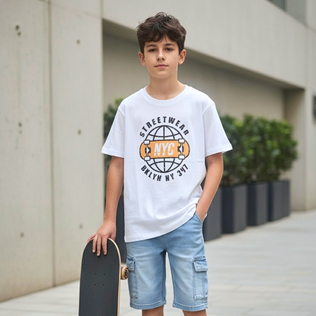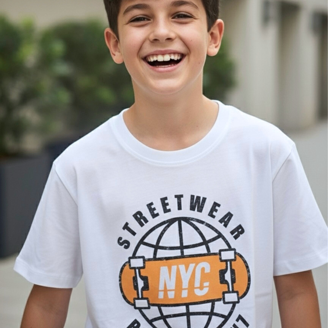 Polo Brooklyn Blanco para Niño con print urbano inspirado en la escena streetwear de NYC. Diseño central con balón y tipografía “BROOKLYN NYC” en tonos naranja y negro sobre fondo blanco. Confeccionado en 100 algodón peruano para un fit cómodo, fresco y duradero.