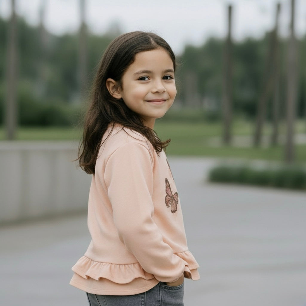 Nuestros polos para niñas en manga larga con volantes y estampado suave al tacto son perfectos para sus días de juegos. El bordado en hilo lurex añade un toque especial y único a cada prenda.