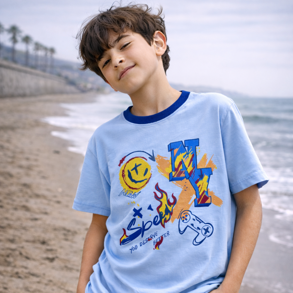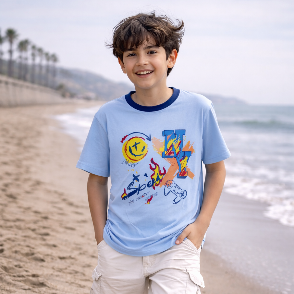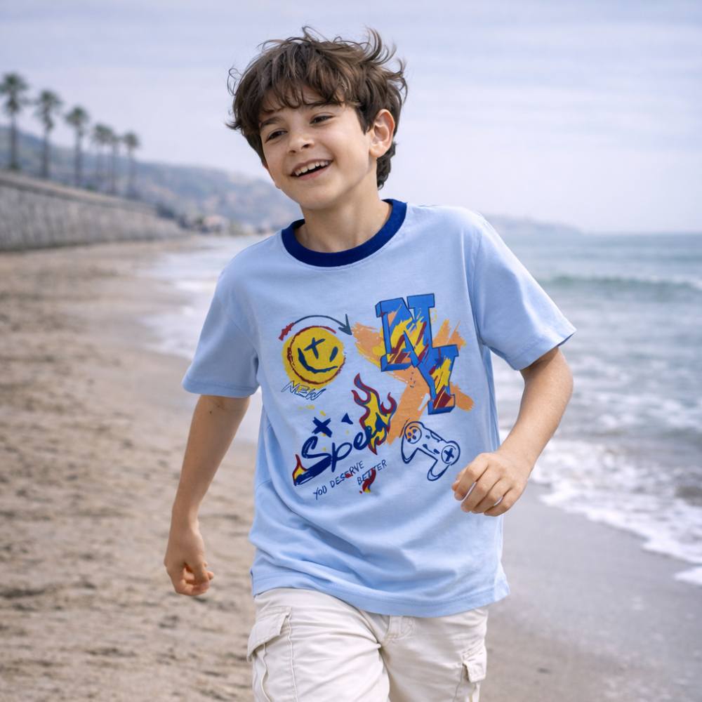 Polo Niño Speed Celeste - ANG Kidz confeccionado en 100% algodón, suave al tacto y cómodo desde la primera puesta. Su diseño gráfico Speed aporta personalidad sin exagerar, con un look actual que funciona perfecto para el día a día.