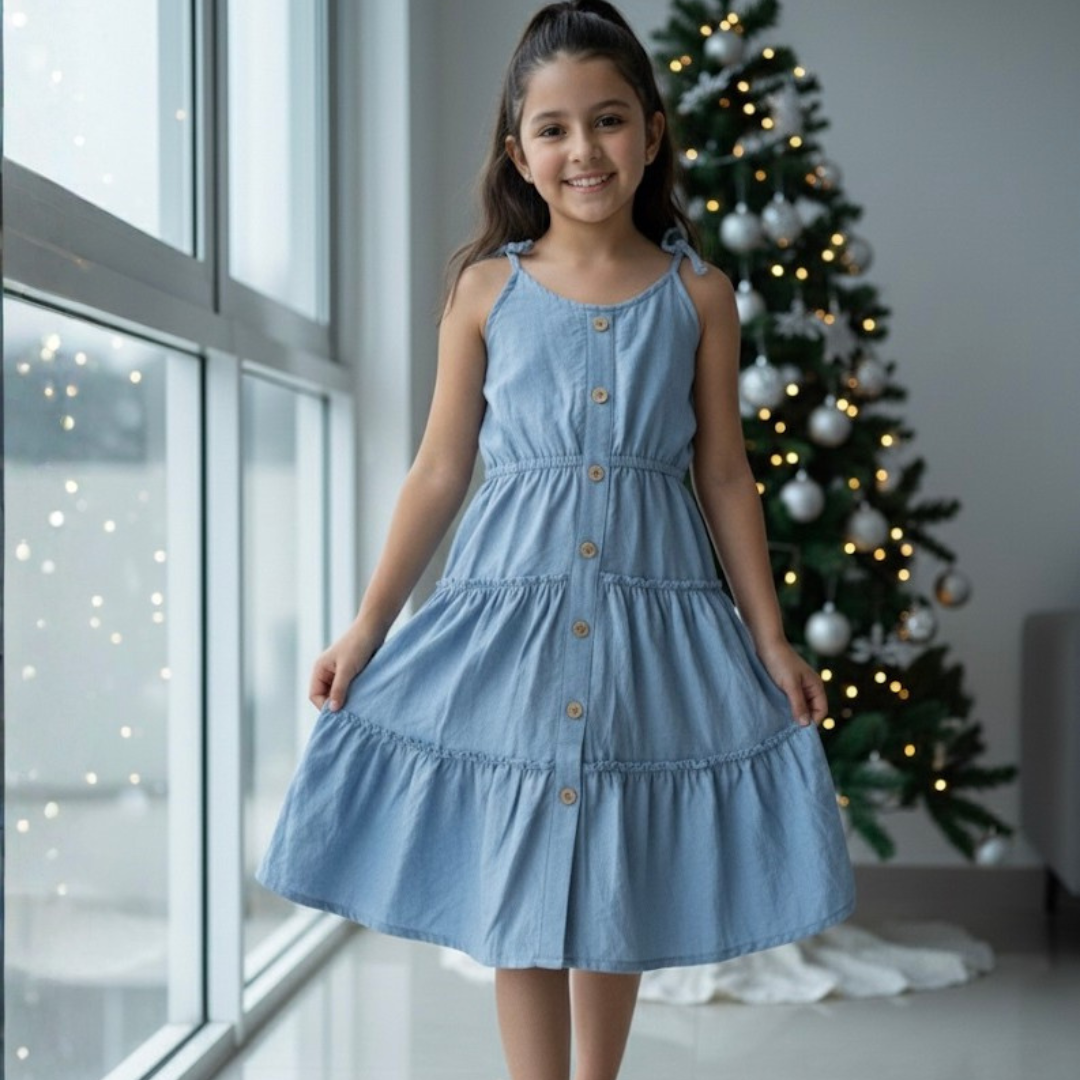 Su diseño incorpora botones frontales y tiras superiores ajustables que permiten un calce cómodo y seguro. La falda amplia con movimiento natural mejora el flujo del vestido al caminar o jugar, ofreciendo un look moderno que se adapta fácilmente a distintas edades. Funciona perfecto con zapatillas blancas, sandalias o accesorios neutros.